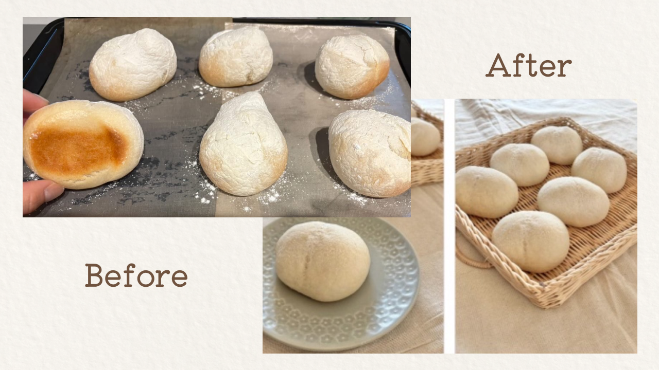 形が歪になってしまう状態から、ふわっふわの可愛らしいフォルムの白パンに変化したメンバーさんのお写真🌟