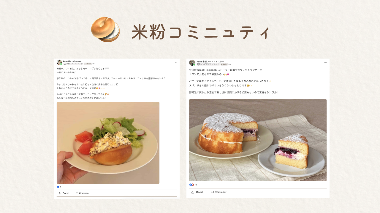 米粉好きな人と繋がれる限定コミニュティ。つくって終わりではもったいない。作ったお菓子やパンをシェアするのが毎日の楽しみになっている方も。