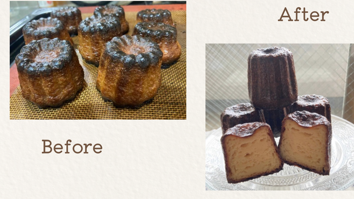 カヌレ作りで肝となるポイントをいくつかお伝え後、カヌレの焼き色がつかず、ふにゃふにゃになってしまった状態から層が綺麗な高級感のあるカヌレに🙈💓